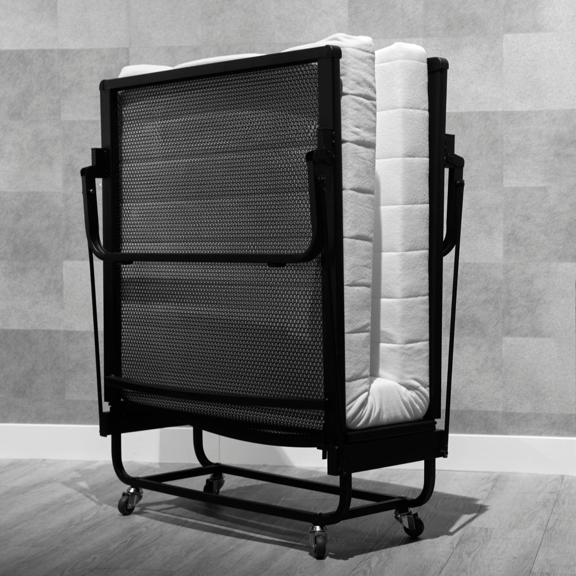 Ruimtebesparend: Ingeklapt neemt het bed nauwelijks ruimte in beslag. Dankzij de soepele wieltjes verplaats je hem moeiteloos naar de berging of een hoek van de kamer.