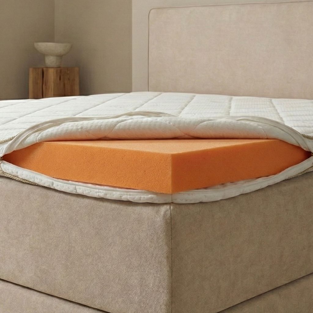 Geen dunne topper, maar een kern die meetbaar dikker is voor één groot, naadloos ligoppervlak.