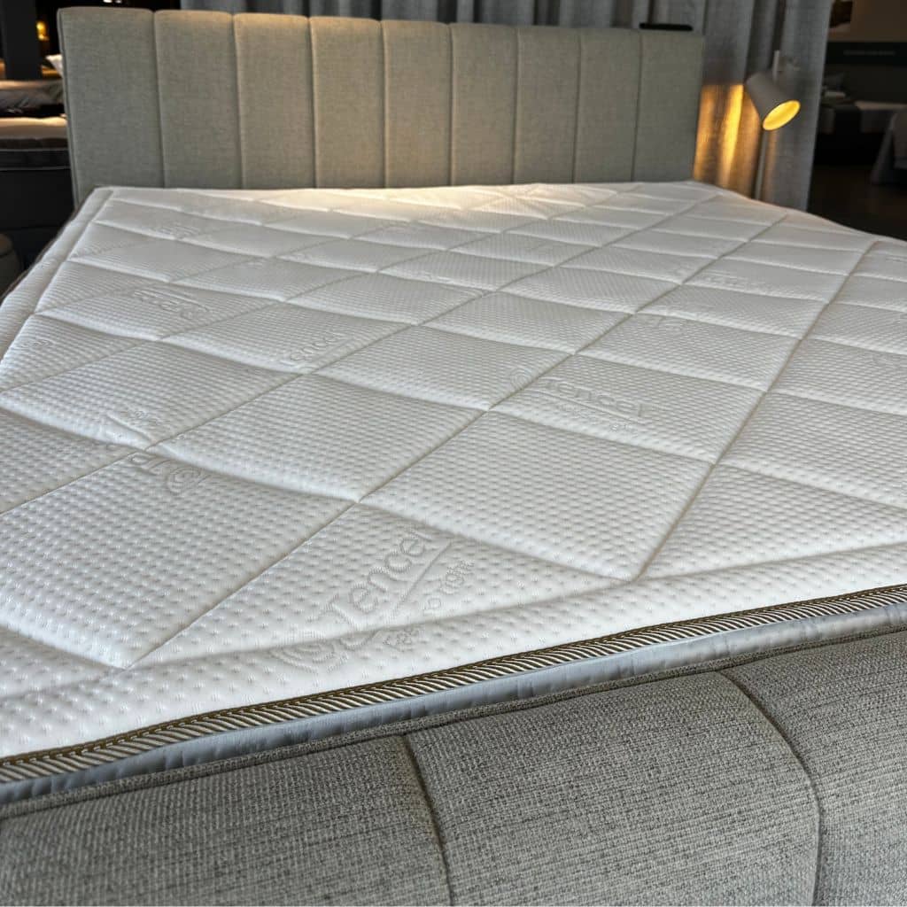 "Voor de buitenkant van mijn toppers heb ik gekozen voor Tencel®. Dit voert vocht veel sneller af dan katoen en voelt daardoor nooit plakkerig aan. Het is ademend, zijdezacht en volledig biologisch afbreekbaar. Zo blijft uw bed hygiënisch en koel, precies zoals het hoort."